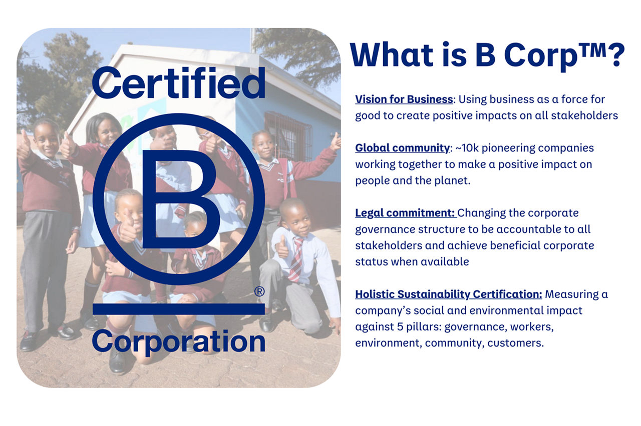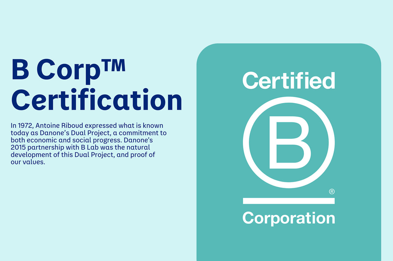 Danone has partnered with B Lab since 2015 to further our purpose-driven approach and accelerate growth of the B Corp movement around the globe. Currently, 85% of Danone's global businesses have achieved B-Corp certification.