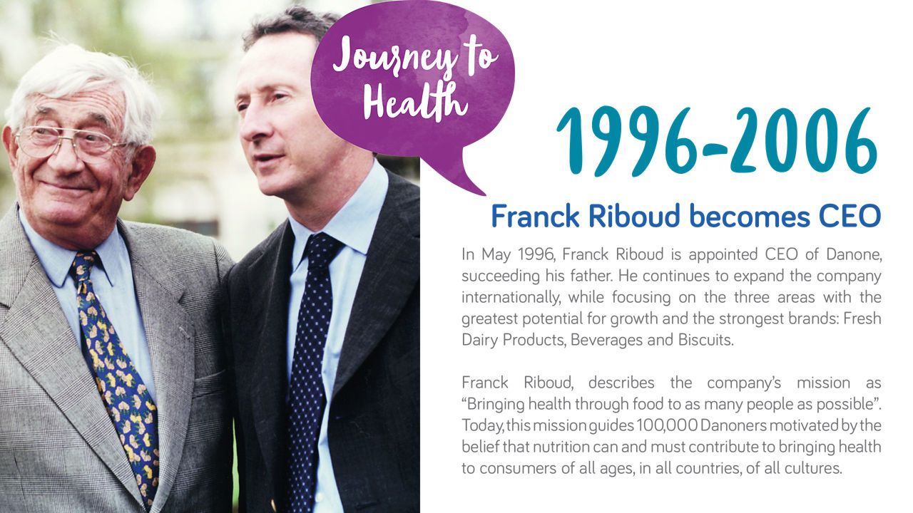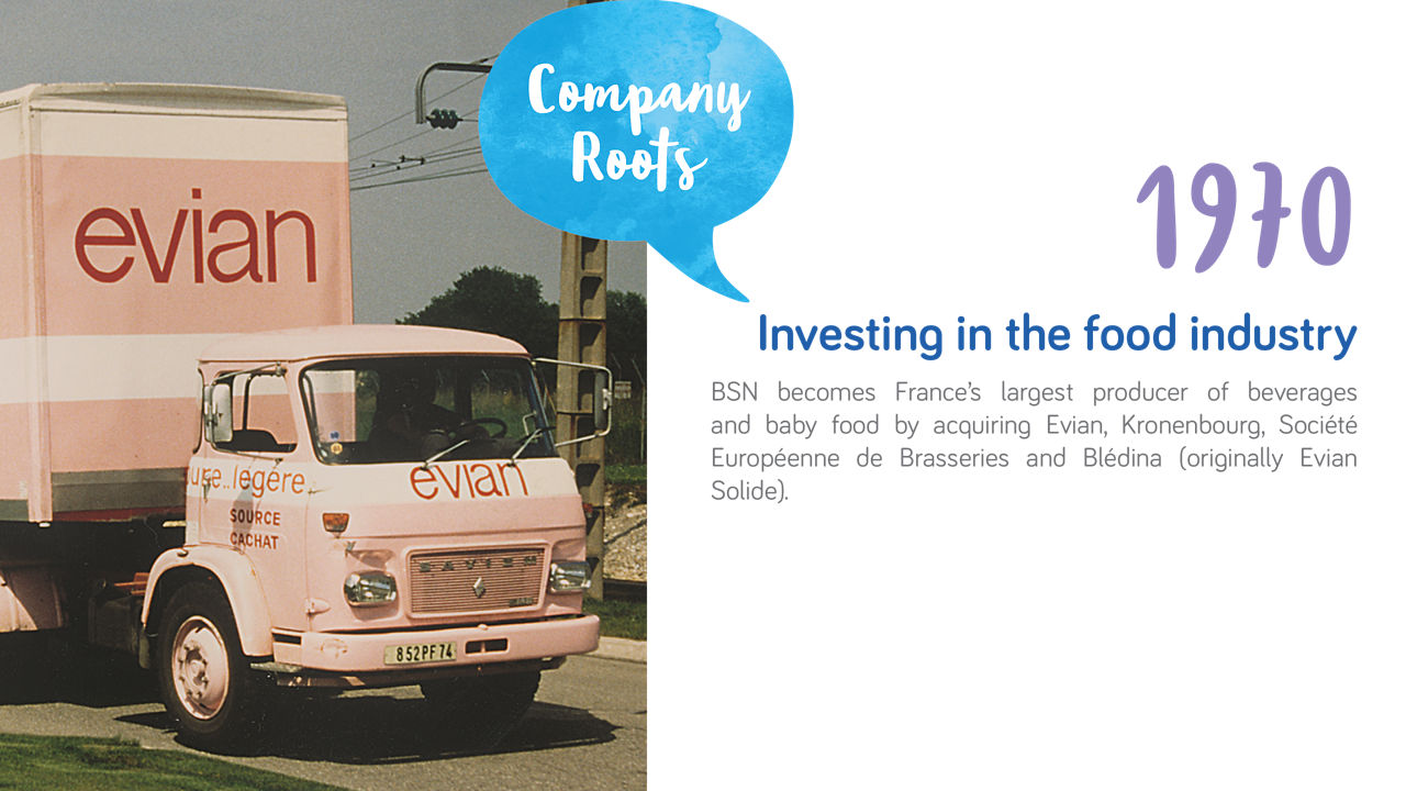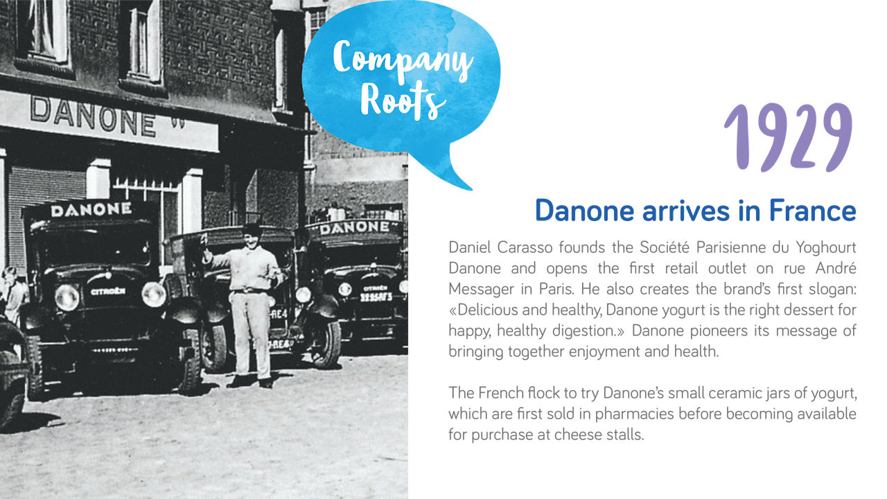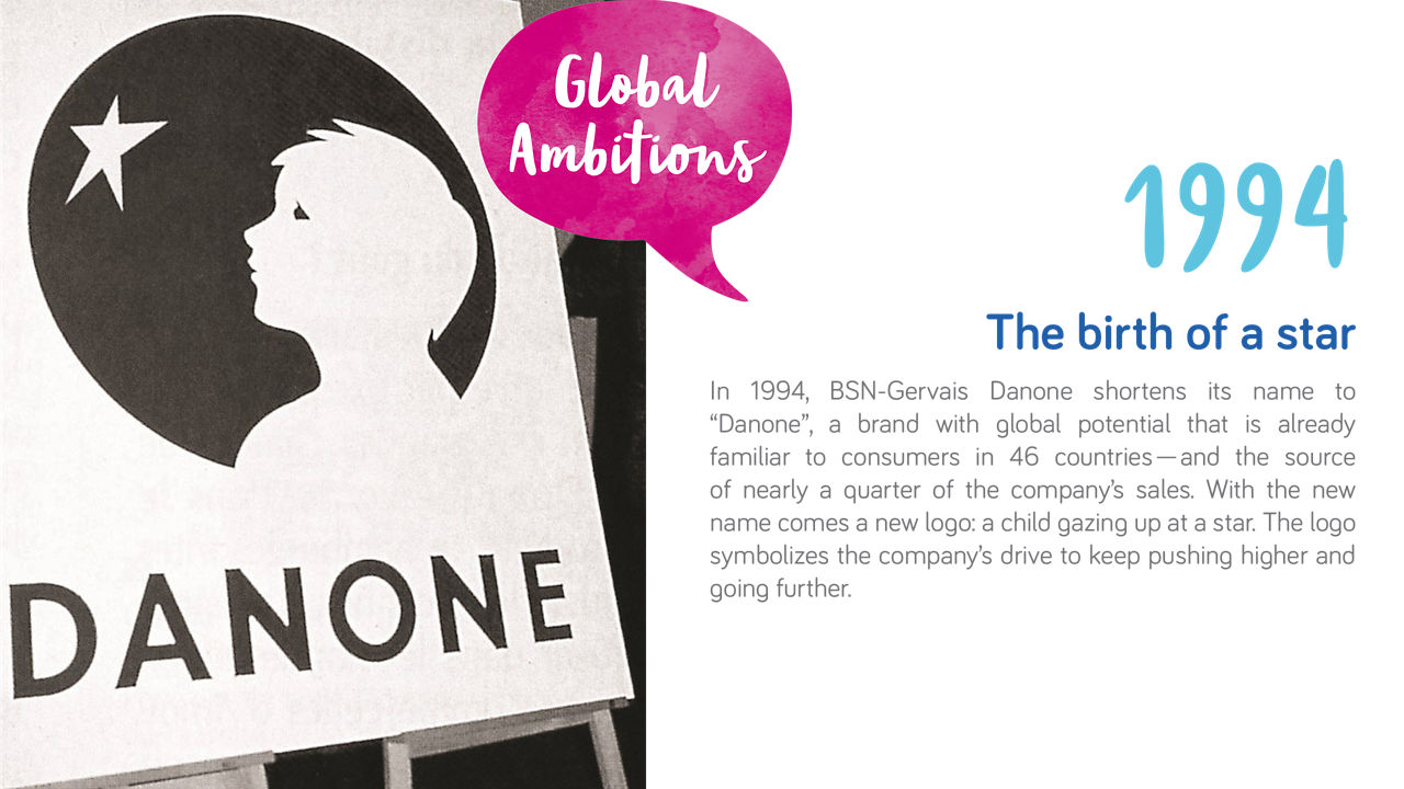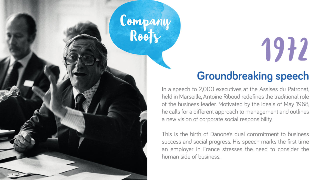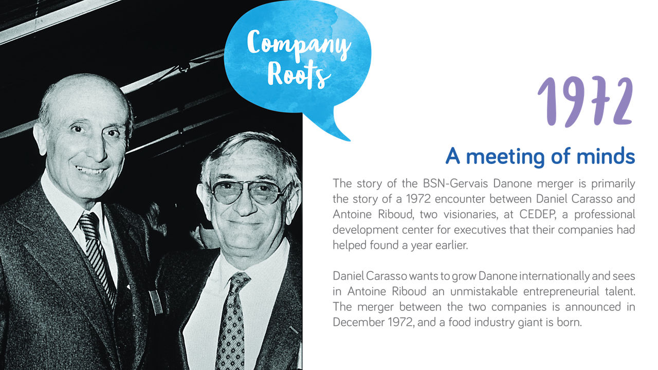 Born thanks to the merger of BSN and Gervais Danone in December 1972, Danone is above all the story of the encounter between Daniel Carasso and Antoine Riboud. This section traces the history of Danone, because our history is the foundation on which we will continue to build and shape the future of this incredible human adventure.