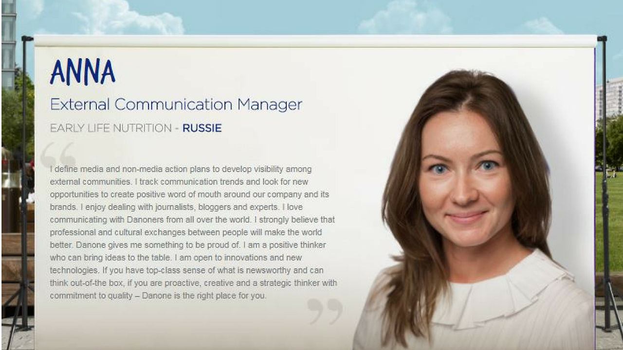 Communication teams shape the reputation of the company and its brands in a sustainable manner among stakeholders (employees, consumers, opinion leaders…). They provide actions with meaning, reinforce Danone’s credibility and bring employees together around the company’s culture; thus creating value over the mid-term. Acting as adviser, Communication helps define key messages and identify relevant communication channels.