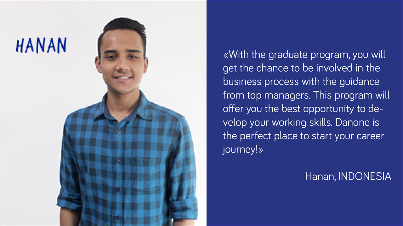 At Danone, it's our mission to bring health through food to as many people as possible. To succeed in this journey, we're looking for young people like you, personalities eager to bring their energy and ideas to a meaningful project. We believe in learning by experimenting and experiencing.