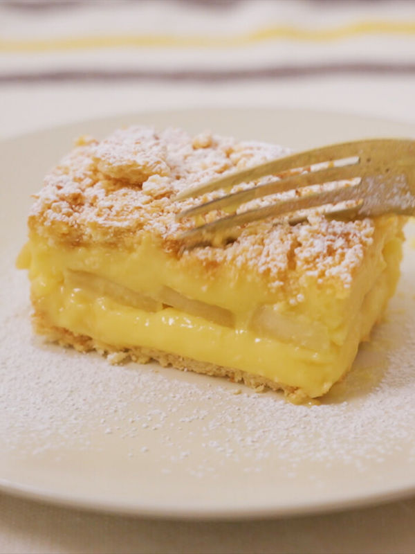 - Once set, lay the apple slices over the custard layer in an even, tightly-packed layer.