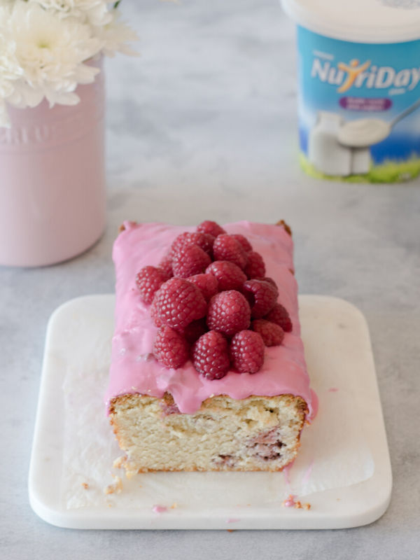 This is a recipe for a gluten free Yoghurt & Raspberry Loaf Cake, made with almond and coconut flours, fresh raspberries and Nutriday Double Cream Plain Yoghurt. Gluten Free flour loves moisture, and the double thick yoghurt ensures that the loaf cake stays very moist, and moreish, making it fantastic treat for morning tea. Recipe by Le Famished Cat
