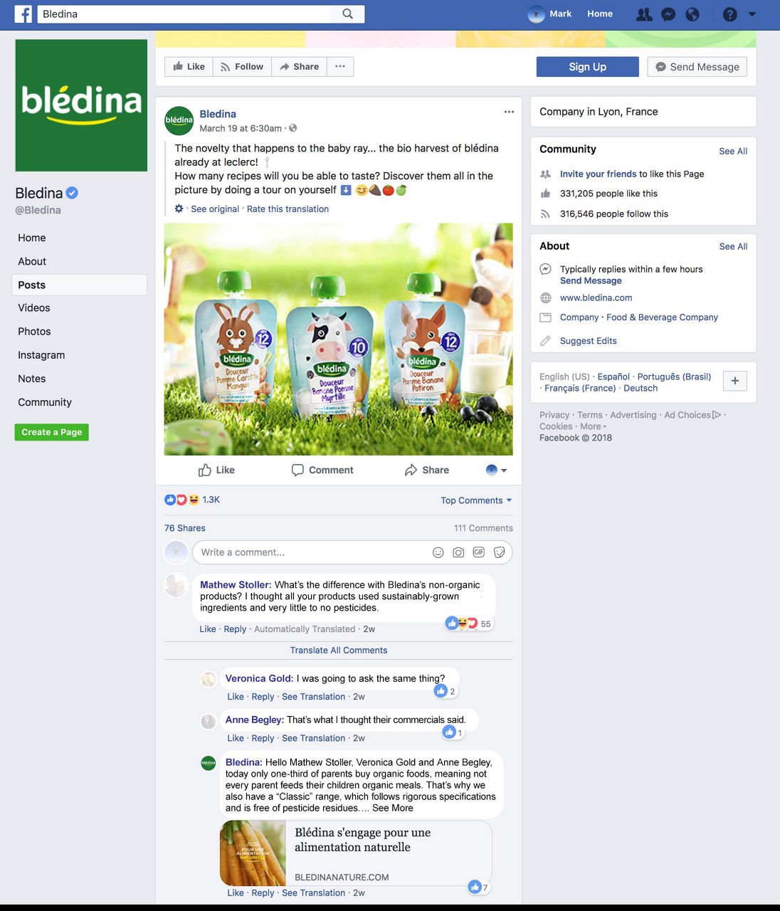 Facebook has become a catalyst for engaging and meaningful customer interactions; in fact, users leave five billion comments, messages and posts on individual company Facebook pages every month. From a parent looking to use a Blédina puree in a recipe to questions about an ingredient’s provenance, the requests on the company’s Facebook page are varied but always answered within hours, often by a Blédina “council member” to deepen the experience. Parents also chime in and share their experiences, further fostering a sense of community.
